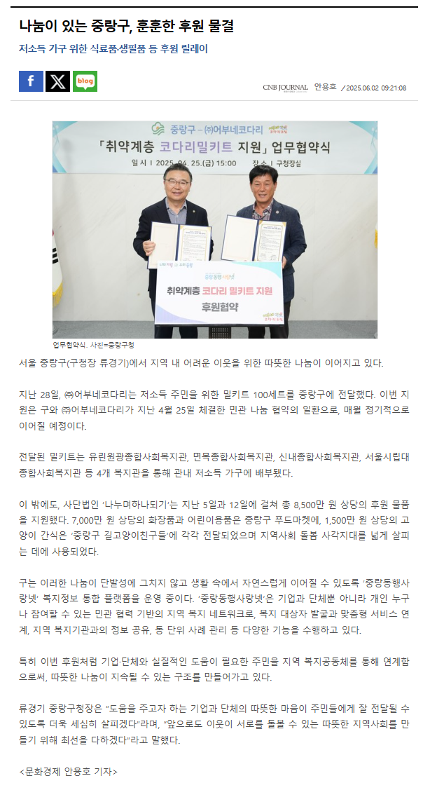 중랑구 & 어부네코다리 밀키트 후원 업무협약식 페이지 정보 작성자 최고관리자 댓글 댓글 0건 조회Hit 123회 작성일Date 25-09-05 10:47 본문 나눔이 있는 중랑구, 훈훈한 후원 물결 추천0 비추천0 페이스북 공유 트위터 공유 목록 이전글중구 & 어부네코다리 밀키트 후원 업무협약식 25.09.05 다음글어부네코다리 밀키트 지원 :: 관악구 자원봉사센터 협약식 25.02.05 댓글 0 댓글목록 등록된 댓글이 없습니다.